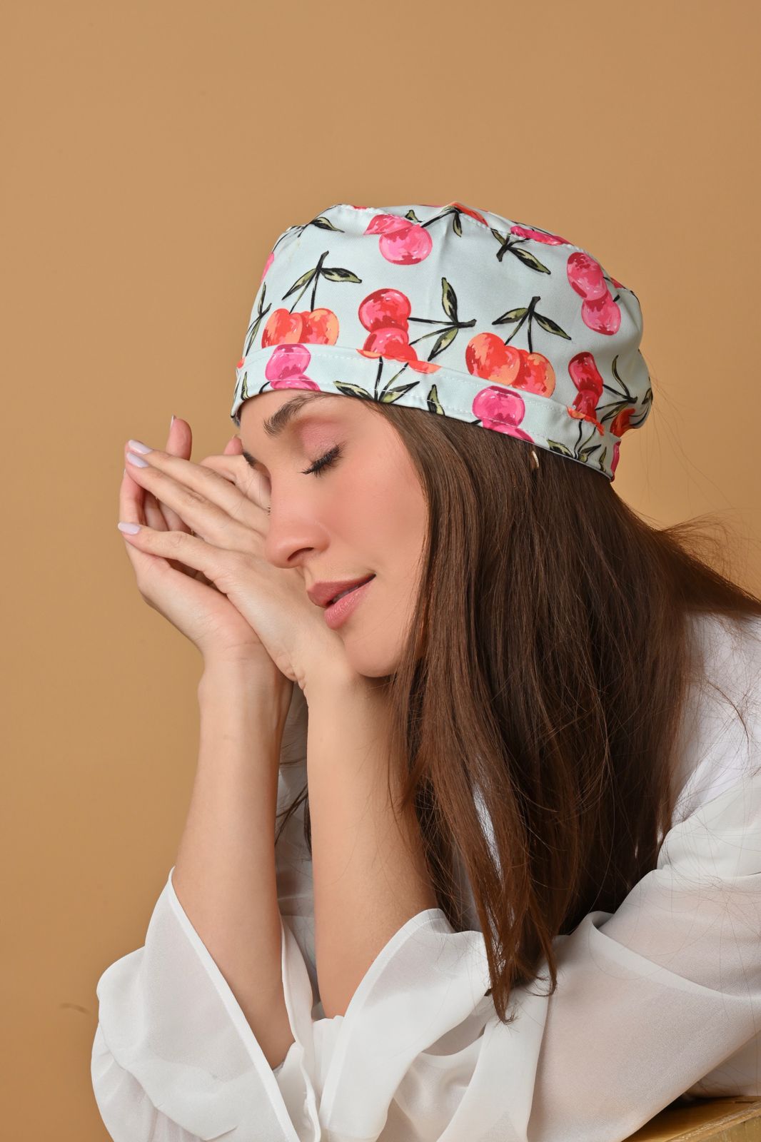 Cofia verde agua con cerezas rojas intensas y hojas verdes, look frutal y vibrante.⚠ Producto sujeto a disponibilidad. Si no hay stock, se confecciona en un plazo de 15 a 20 días hábiles.